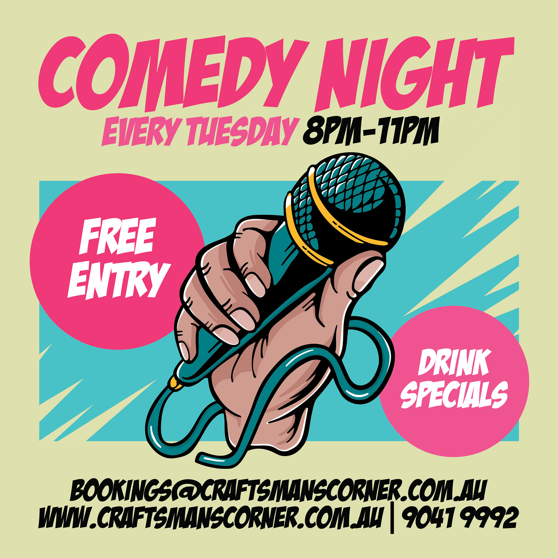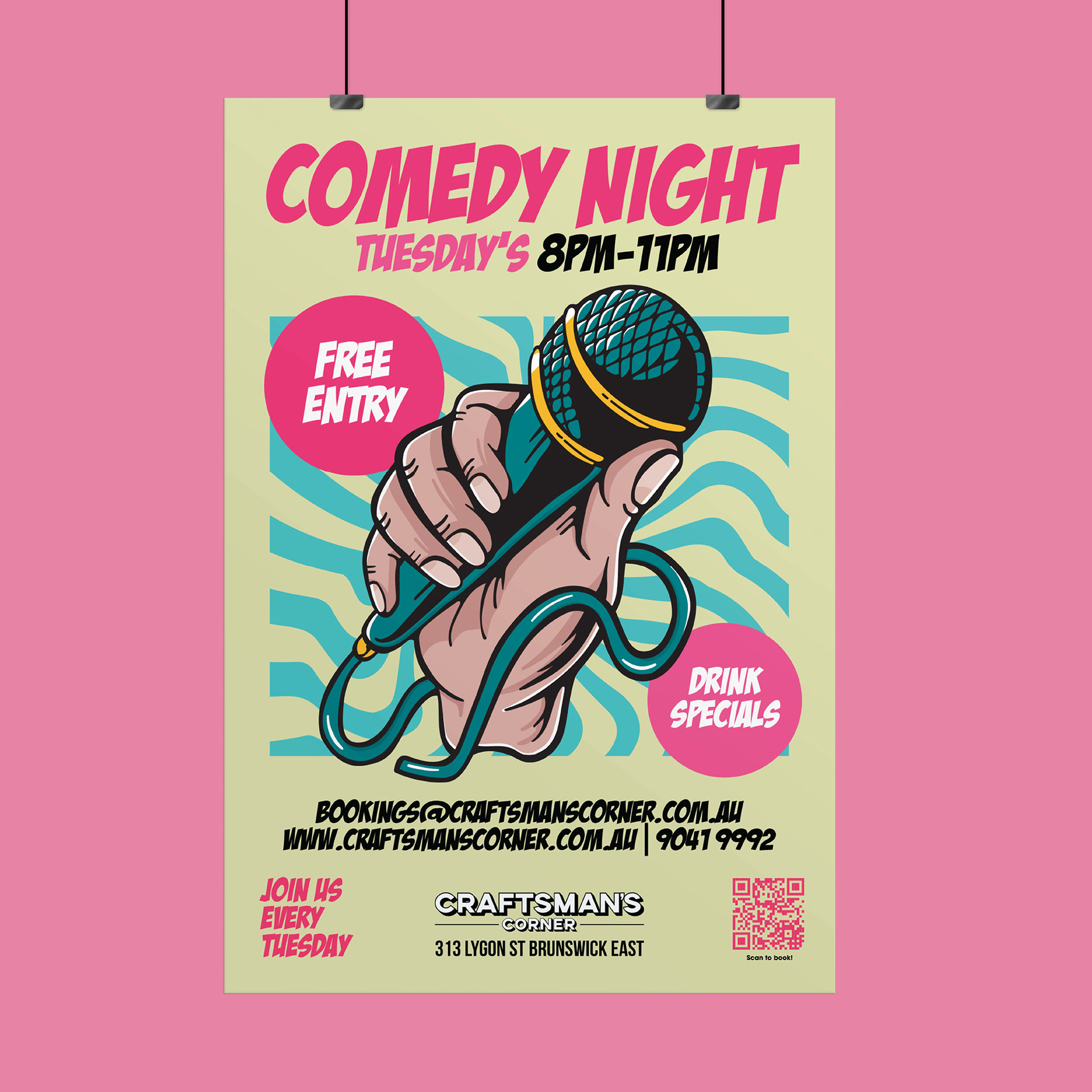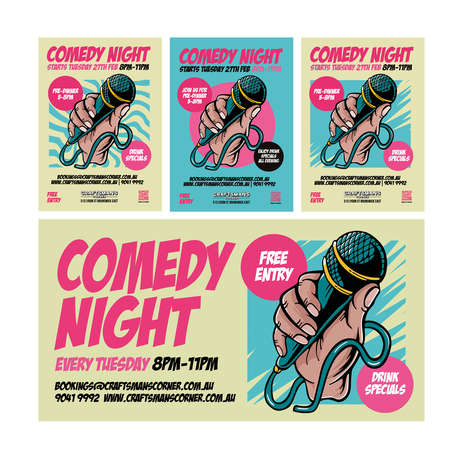 Briefed to create some artwork to promote The Craftsman's Corner's new Comedy Night event, I illustrated a microphone within Illustrator on the iPad and finished the poster and digital assets in a comic style that pops.